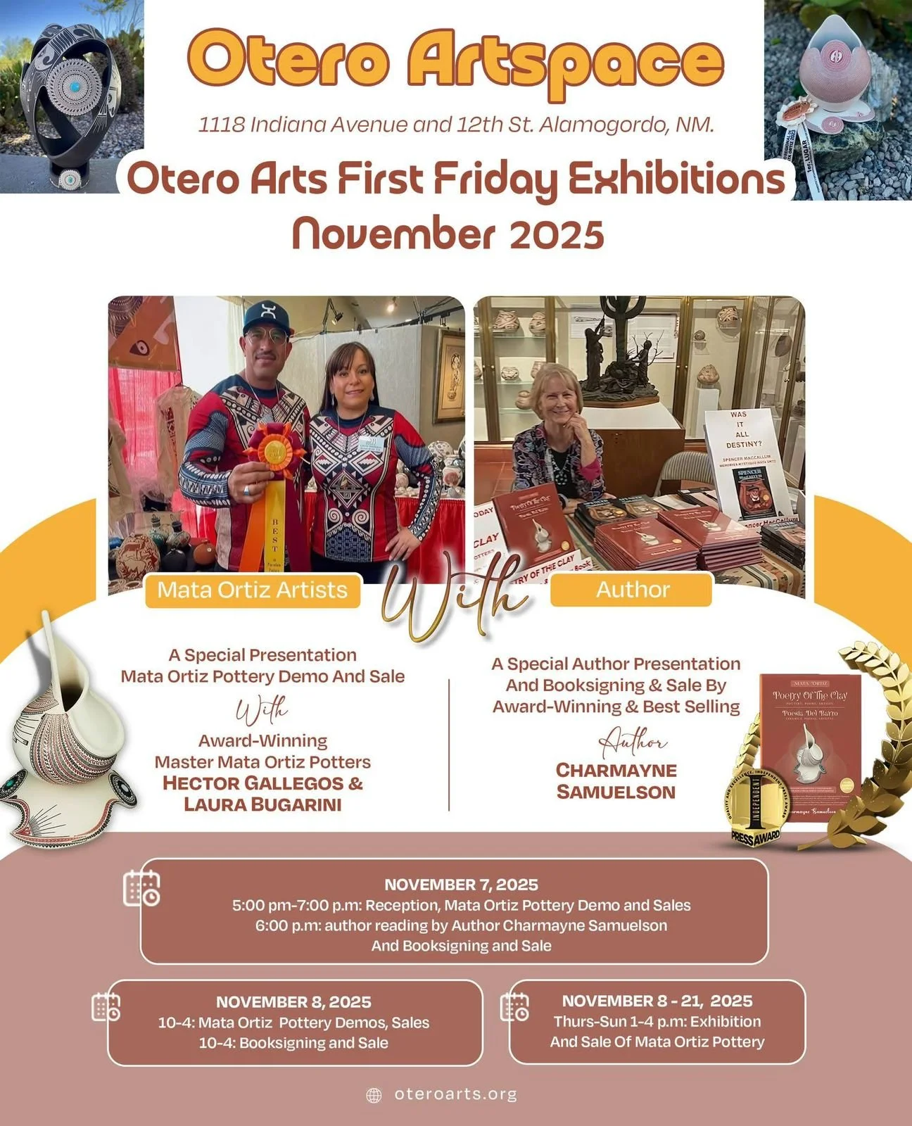 Otero Artspace in Alamogordo, NM, presents a month-long celebration of art and storytelling through pottery and literature. The event features award-winning Mata Ortiz master potters Héctor Gallegos and Laura Bugarini, offering live pottery demonstrations and sales, alongside author Charmayne Samuelson, who will host a reading, book signing, and sale of her award-winning book “Hearts of the Clay.”